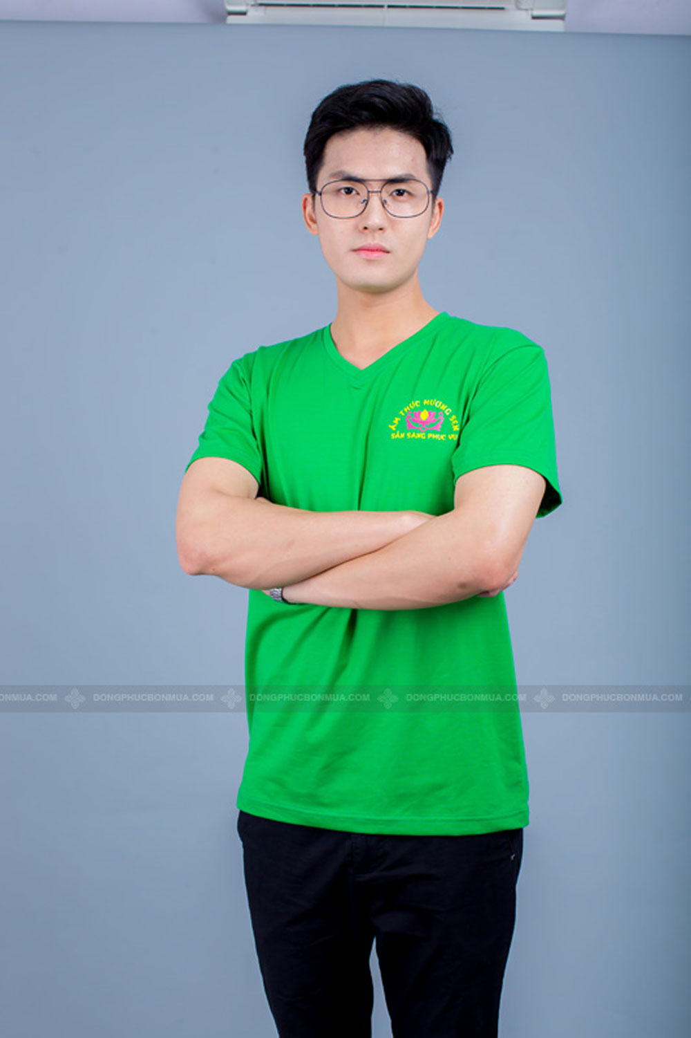 Đồng phục áo phông nhà hàng ẩm thực Hương Sen được thiết kế với kiểu dáng cổ chữ V, tạo điểm nhấn nổi bật và mang lại sự hiện đại cho trang phục. Thiết kế này không chỉ mang lại vẻ trẻ trung, năng động mà còn giúp nhân viên thoải mái hơn khi vận động.